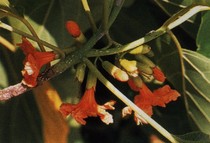 Ein früh aus Polynesien eingeführter schattenspendender Baum, dessen Holz zur Herstellung von Gebrauchsgegenständen und Götzenbildern geschätzt wurde. Die Blüten sind hellorange und röhrenförmig.