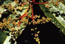 Dieser Baum wird über 30 m hoch. Er trägt Rispen mit winzigen grünlich-roten Blüten, aus denen sich seine exotischen üppigen Früchte bilden.