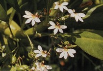Dieser an der Küste wachsende zähe Strauch trägt weiße fünfblättrige Halbblüten und weiße, fleischige Beeren. Nach der Überlieferung stehen die Blüten für getrennte Geliebte, wobei die andere Hälfte zum Mountain Naupaka gehört.